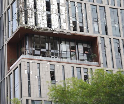 1 of 2 | A damaged building stands in the Dubai International Financial Center. The damage was caused by debris from the interception of an Iranian drone attack in Dubai, United Arab Emirates, Friday. Those in the UAE are being warned not to take photos or videos of damage or they could be charged under cybercrime laws. Photo by a stringer/EPA