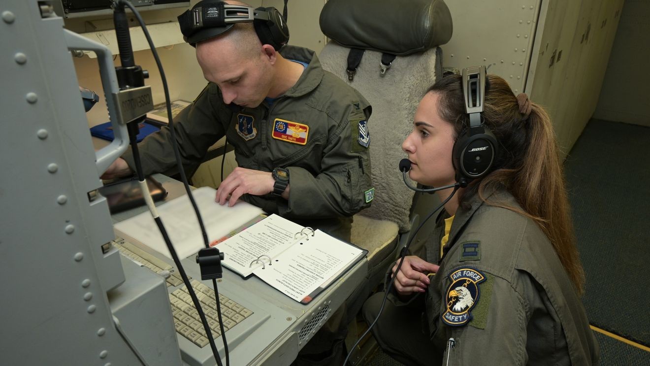 U.S. Air Force Col. Eric Smith, left, 116th Operations Group commander, and Capt. Ariana Savino, 330th Combat Training Squadron (CTS) navigator instructor, make final preparations aboard an E-8C Joint STARS before the 129th and 330th CTS’ fini flight from Robins Air Force Base, Georgia, Feb. 23, 2023. (U.S. Air National Guard photo by Barry Bena)