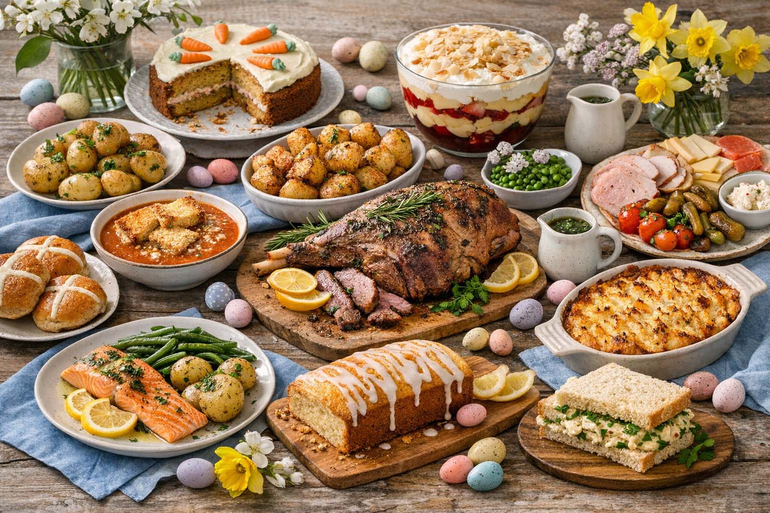 A traditional UK Easter meal often includes roast lamb, roast potatoes, seasonal vegetables, gravy, mint sauce and a dessert such as trifle or carrot cake.