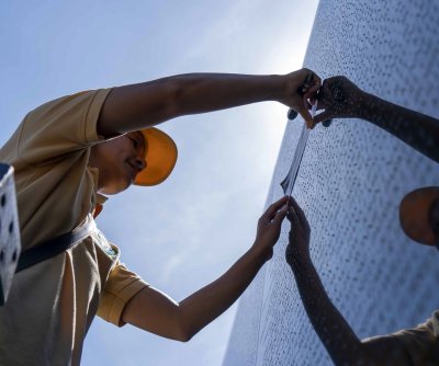 1 of 8 | A National Park Service volunteer etches a name onto paper at the Vietnam Veterans Memorial during Memorial Day weekend in Washington, D.C., on May 27, 2023. On March 8, 1965, about 3,500 U.S. Marines landed in Da Nang, South Vietnam. File Photo by Bonnie Cash/UPI | License Photo