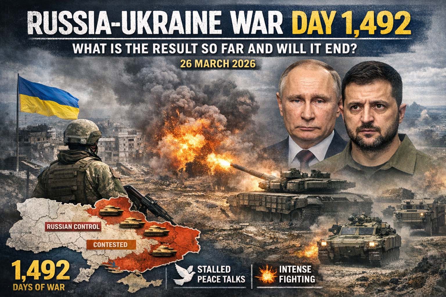 As of 26 March 2026, it is day 1,492 of Russia’s full-scale war against Ukraine, counting from 24 February 2022. So far, there is no decisive final result: Russia still controls about 20% of Ukrainian territory, but it has not achieved a complete victory, while Ukraine continues to resist, strike Russian logistics and energy infrastructure, and prevent a major battlefield breakthrough.