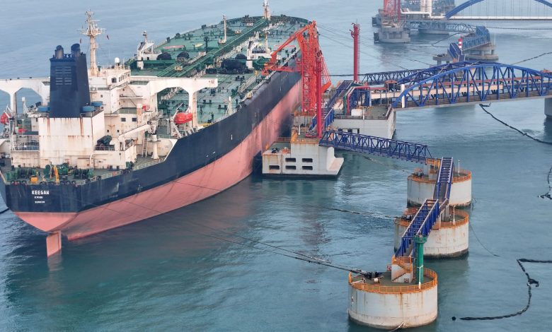 This picture taken on March 26, 2026 shows an oil tanker unloading crude oil at a port in Yantai, in…