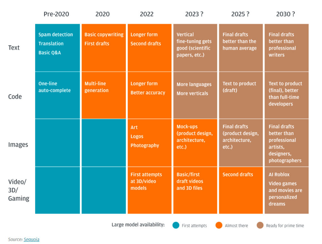 Generative AI’s outputacross text, code, images and video is expected to improve exponentially through 2030, surpassing what human workers can produce.